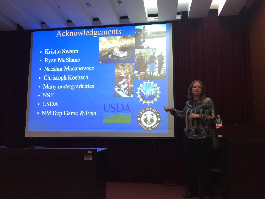 Boeing教授介绍了有关在新墨西哥的沙漠坑洞中从细菌到鱼的食物网转变的研究成果,分别从细菌,到浮游动物、底栖无脊椎动物、鱼研究生物与水质参数的关系,发现不同梯级的物种与水质有相应的关系。浙江大学逯慧杰研究员讲授了有关污水处理中资源回收相关的研究,分别从卫生纸回收、P回收、藻朊酸盐回收、聚羟基脂肪酸(PHAs)回收及生物能利用五大可回收利用资源方面进行阐述,许多新颖的回收技术吸引了大家的关注。讲座结束后的提问环节,现场师生与两位教授进行了深入互动交流,学术气氛浓厚。