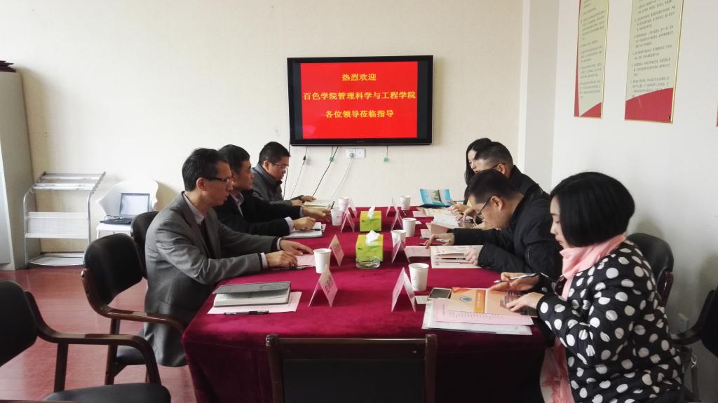 11月30日上午,百色学院管理科学与工程学院院长周叮波一行4人来亚洲AV 调研。学院院长郑荣跃、副院长柳俊哲、刘干斌等接待了来访客人。