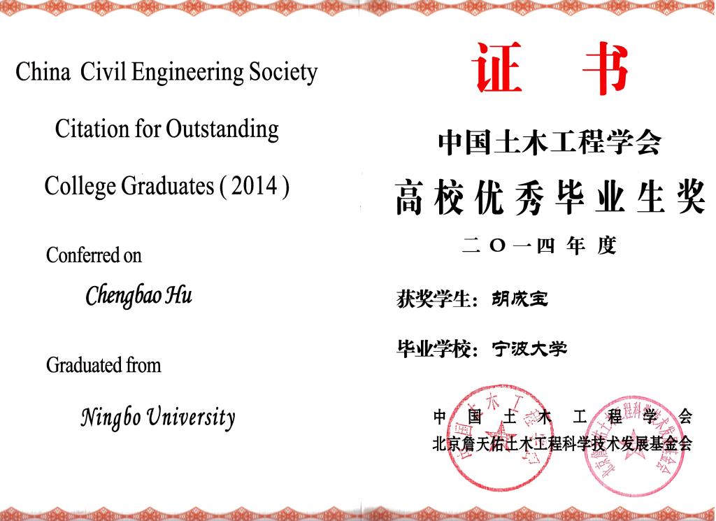 土木工程专业毕业生胡成宝同学荣获2014年度“中国土木工程学会高校优秀毕业生奖”。
