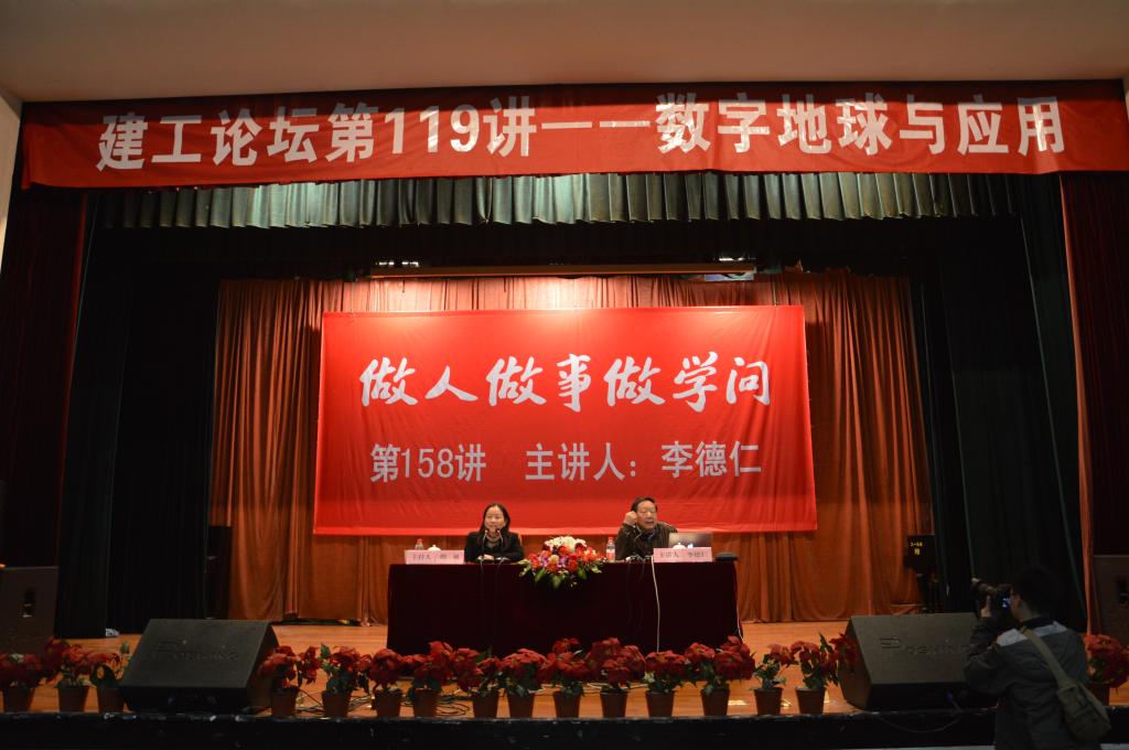12日晚上,“做人做事做学问”名家系列讲座第158讲暨建工论坛119讲在锦绣小剧场举行。中国科学院院士,中国工程院院士,国际欧亚科学院院士,摄影测量与遥感学家,武汉大学教授李德仁以《数字地球与应用》为题做了精彩的演讲。讲座由宣传部部长胡敏老师主持。