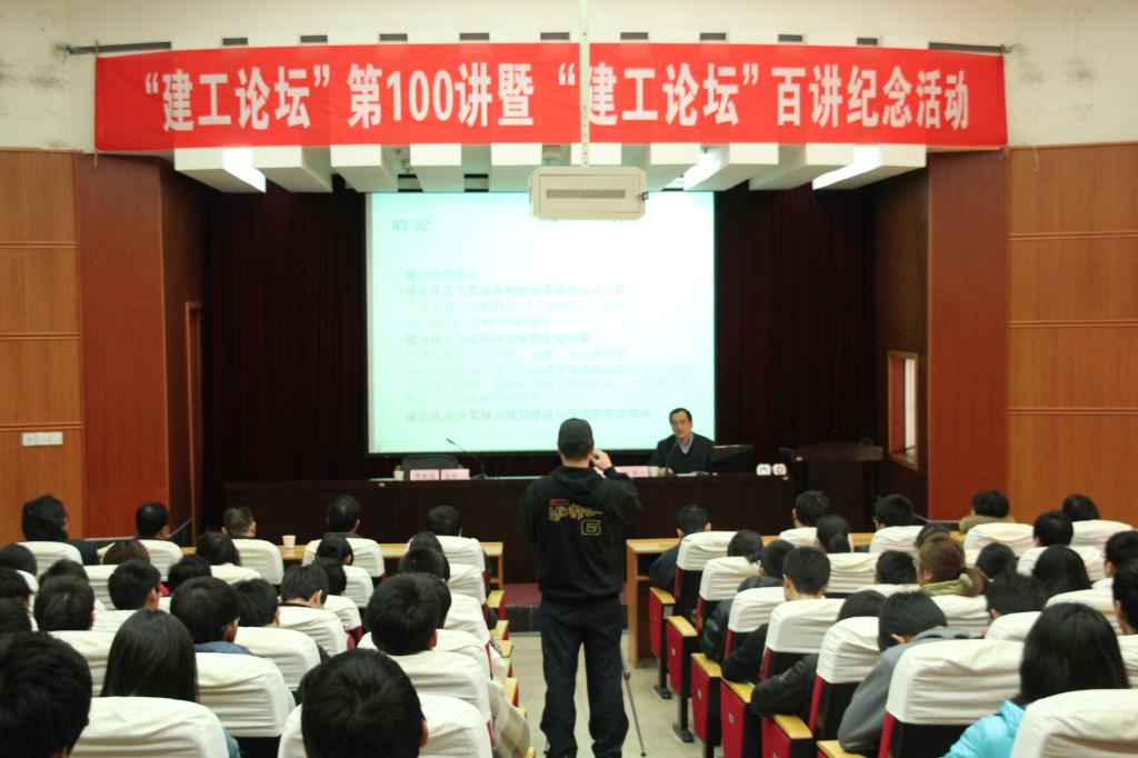 师生共同迎来"建工论坛"第一百讲.本场讲座由省建设厅副厅长、党组成员应柏平主讲,院长郑荣跃教授住持.