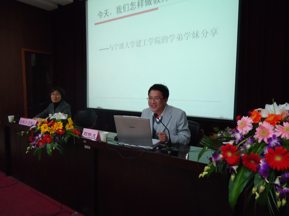 地理教育专业,现任宁波市第三中学党总支副书记、宁波市地理教育学会常务理事、宁波市青联委员等职,曾获宁波市教坛新秀,现为宁波市特级教师跨区带徒学员。报告会上,刘伟龙校友从回忆自己在大学生活开始,讲述了自己“不用功”的高中生涯、难忘的代课生活、重回课堂的回忆等一些亲身经历,并提出广大师范类学生要加强专业学习,提升自己的专业素养,苦练师范技能,为今后的教学工作打下扎实基础。
