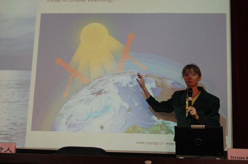 Eva-Lena Aronsson女士是瑞典籍化学工程师,在瑞典环境保护领域享有很高声誉和杰出贡献。1978年开始她的化学研究生涯。多次参与瑞典以及周边国家环境保护活动,多次为瑞典高校的学生讲授相关知识。她在报告中就全球的环境问题进行了简要分析,并从可持续发展的角度,针对如何解决水、气、废、生态等问题进行了详细讲解,其中还介绍了3R和LCA理念,受到了广大师生的欢迎。Eva-Lena Aronsson女士一行还与亚洲AV