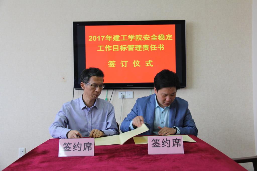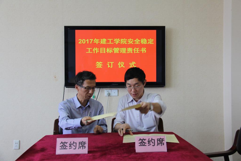 5月8日下午,亚洲AV 安全稳定工作目标管理责任书签订仪式在学院303会议室举行。会上,学院安全稳定工作责任人郑荣跃院长分别与各个基层学术组织系/所负责人签订了《2017年建工学院安全稳定工作目标管理责任书》。