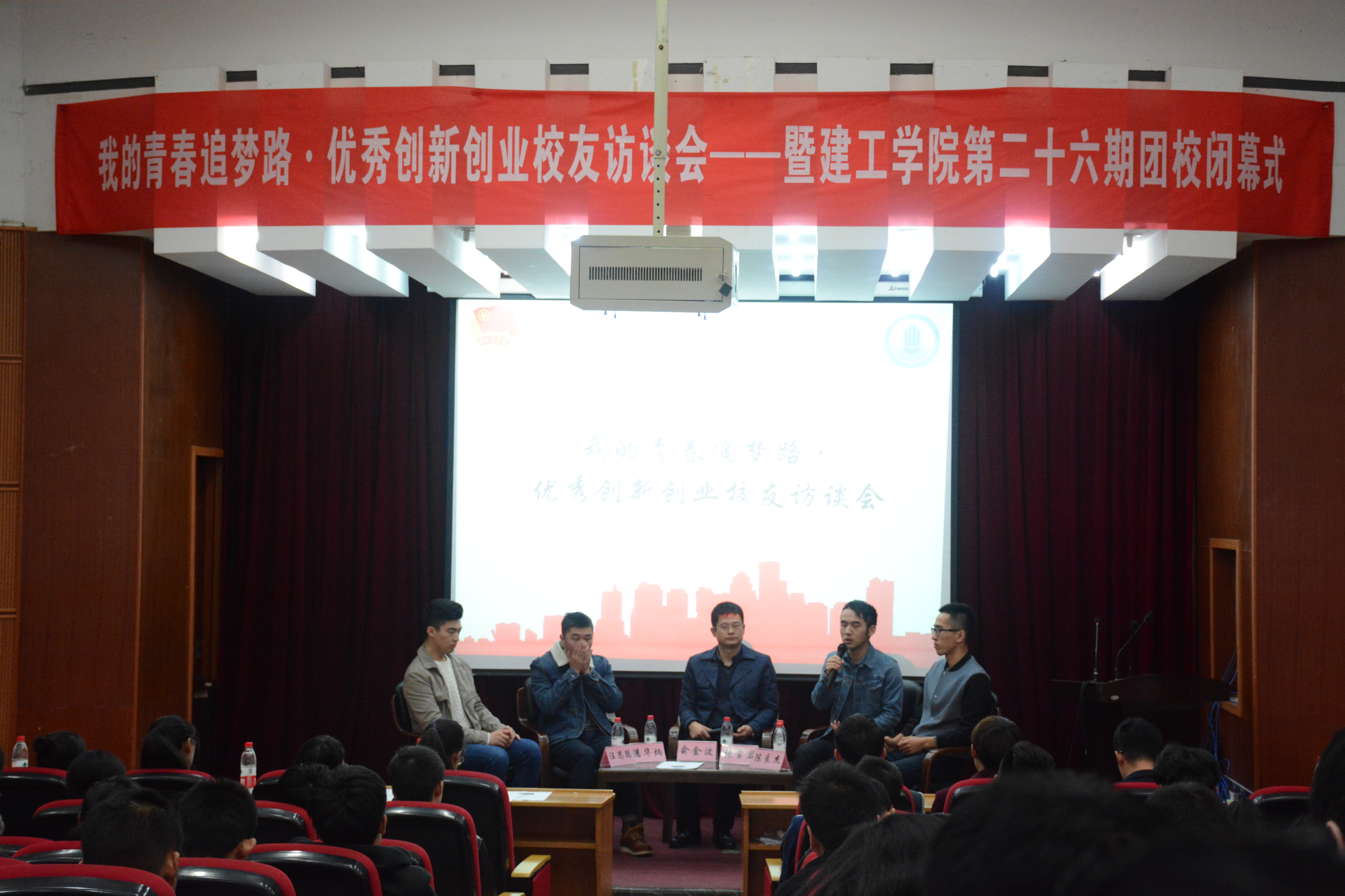 2017年11月25日下午3点,我的青春追梦路•优秀创新创业校友访谈会暨建筑工程与环境学院第二十六期业余团校闭幕式在建工报告厅圆满举行。本次团校由建工学院辅导员王朝东老师主持,访谈会由建工学院党委副书记俞金波老师采访主持,邀请了四位在创新创业有卓越成就的学长进行分享经历和经验,建工学院全体团学干部、各班级代表参加了本次活动。