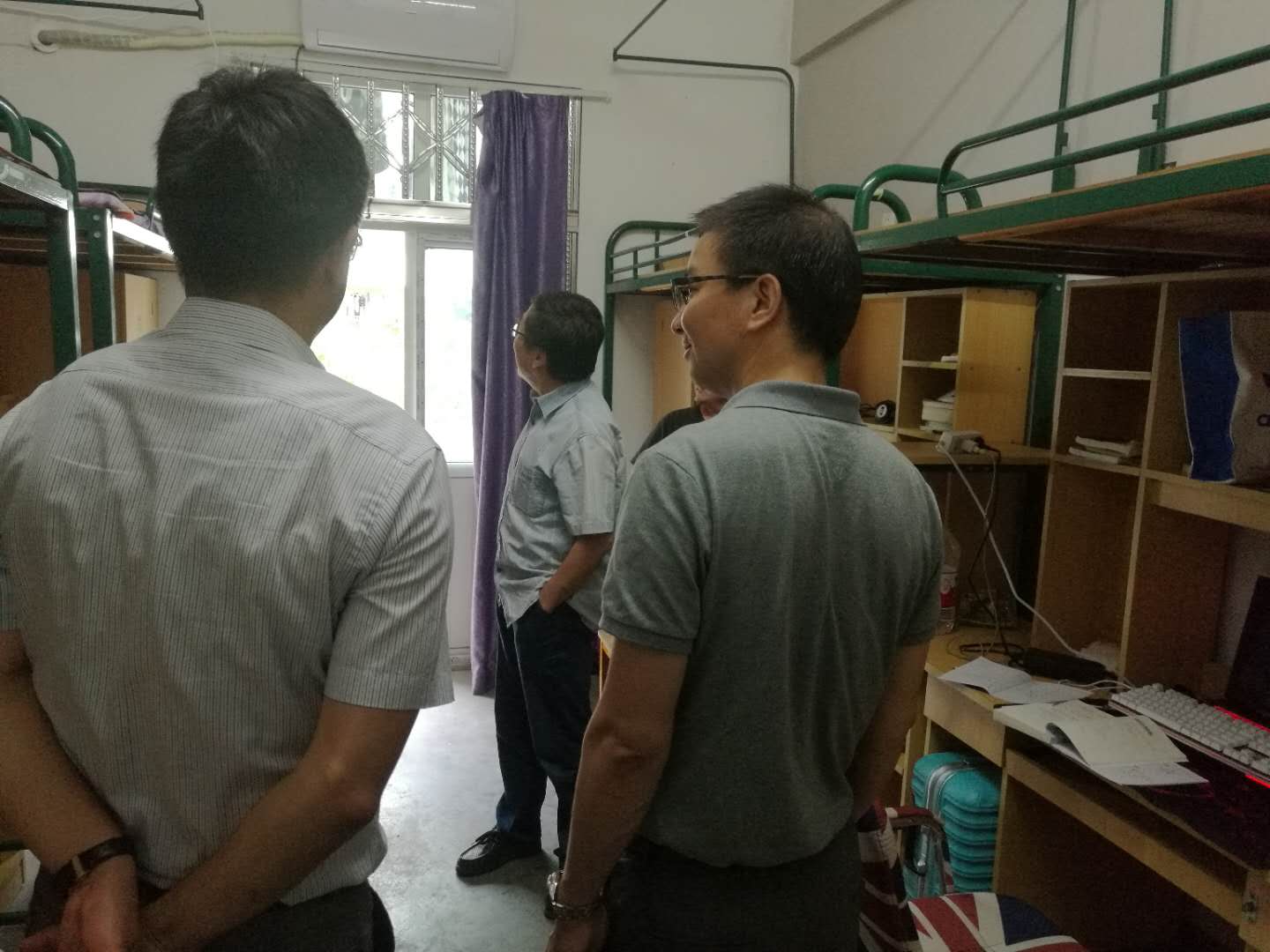 学校领导在院领导的陪同下视察了同学们的住宿卫生及宿舍安全状况,并亲切地与在校同学交流,与随访的相关人员就学校基础设施建设及文明寝室文化校园建设进行了探讨。