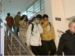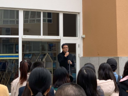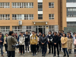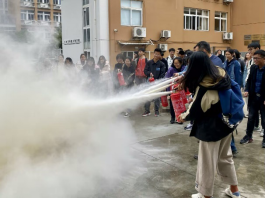 随后开展了消防实操演练活动。通过“烟雾弹”模拟起火场景,100余名师生进行了逃生自救预演;火警声响后,演练人员按逃生路线迅速离开室内到楼外集合点,所有演练人员撤离时用手、衣袖捂住口鼻,弯腰撤离。通过模拟汽油起火事故,演练人员按照徐作义老师指导的灭火流程,迅速拿起灭火器进行灭火。