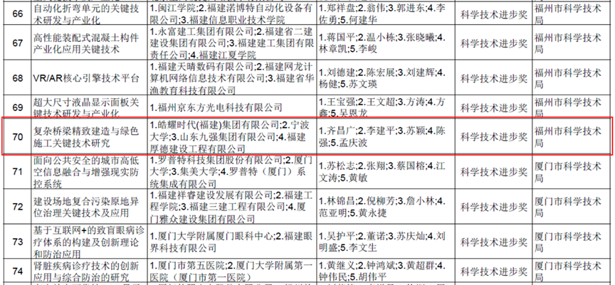 (1)2020年度福建省科学技术进步奖,三等,复杂桥梁精致建造与绿色施工关键技术研究,排名:1/5,发布单位:福建省人民政府