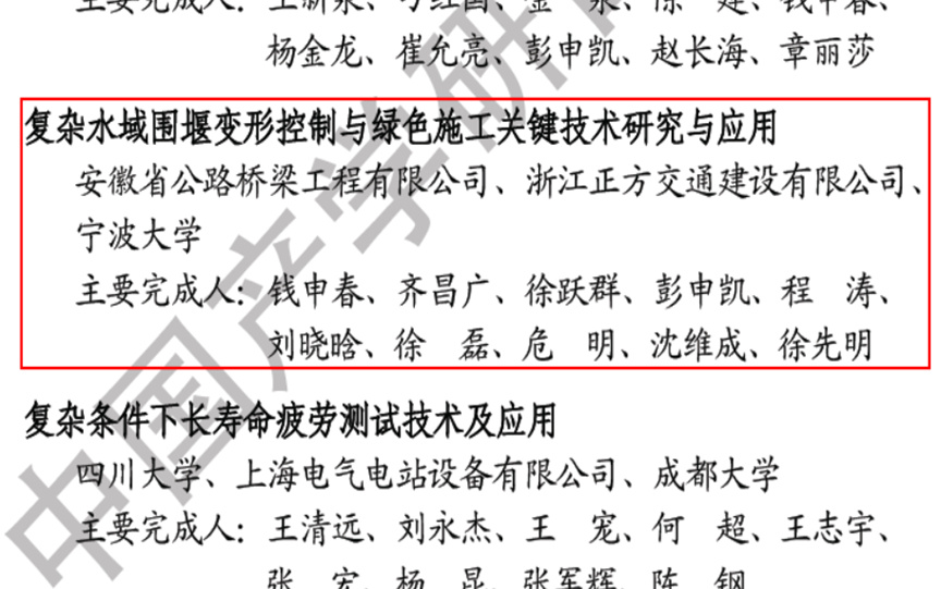 (2)2021年度产学研合作创新成果奖,二等,复杂水域围堰变形控制与绿色施工关键技术研究与应用,排名:2/10,发布单位:中国产学研合作促进会