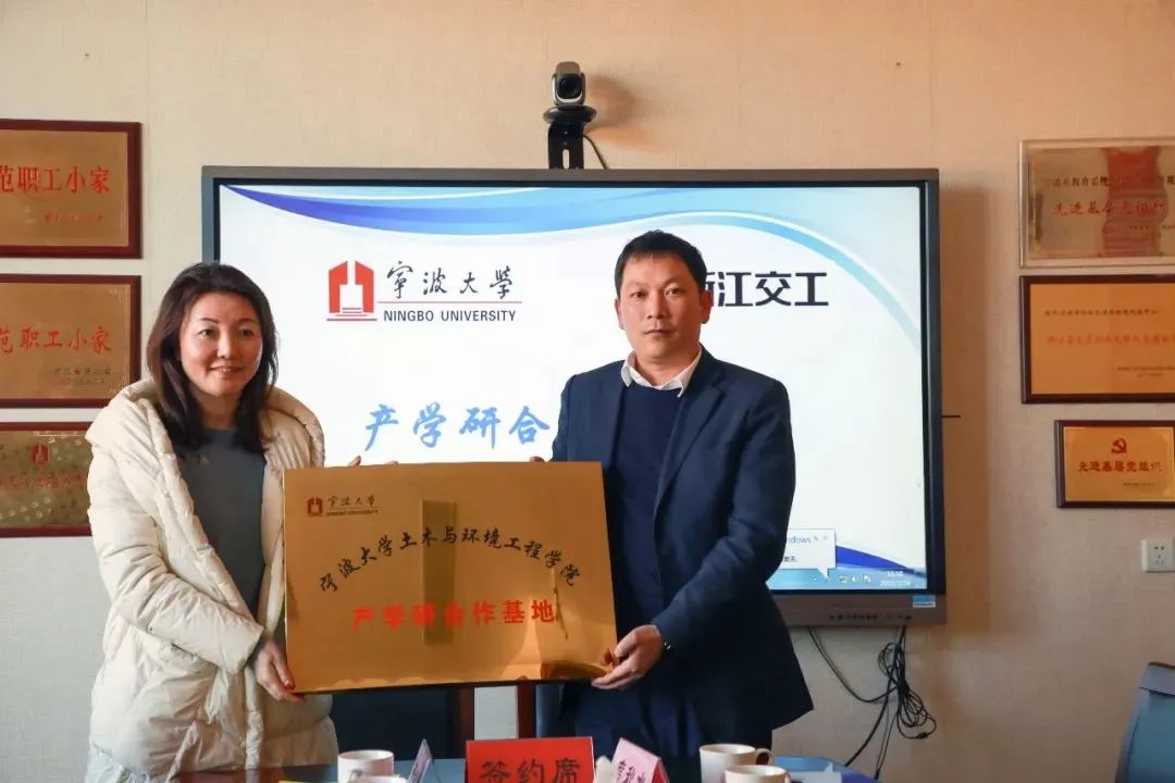 仪式上,孔晓虹向对方详细介绍了亚洲AV 的办学历史、专业优势、学科发展、师资队伍、人才培养等情况;章子华、贺智敏就亚洲AV 学生特色、实习环节情况作了补充介绍。随后,潘江波介绍了浙江交工集团大桥分公司近年来的发展,并就公司在人才需求、员工培养及员工职业发展等方面的情况也作了详细的说明,希望以实习基地签约授牌仪式为契机,加强校企合作,在合作共赢、互惠互利的共识下,优势互补,携手并进。随后,孔晓虹代表学院将“产学研合作基地”牌匾授予浙江交工集团大桥分公司。
