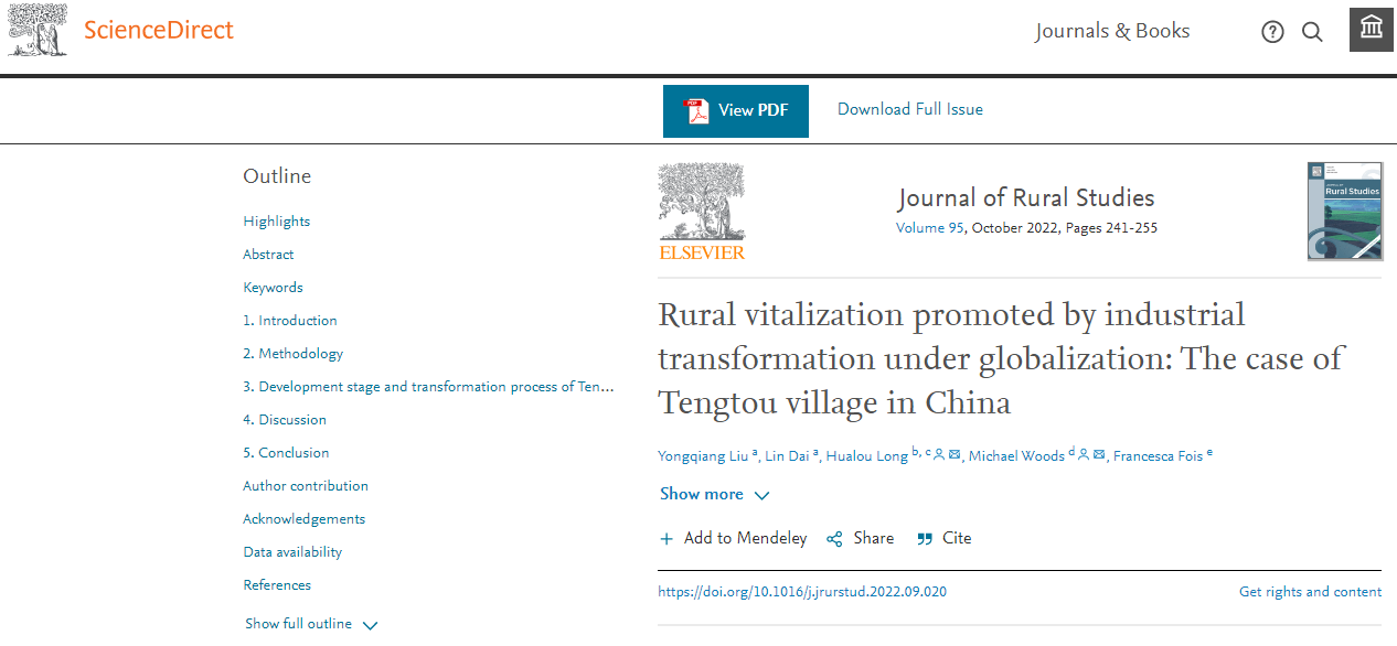 近日,学院地理学科刘永强副教授为第一作者,中国科学院地理所龙花楼研究员与英国亚伯大学Michael Woods教授为共同通讯作者,在农村发展研究领域的国际权威学术期刊Journal of Rural Studies在线发表了题为“Rural vitalization promoted by industrial transformation under globalization: The case of Tengtou village in China”的最新研究成果,论文以亚洲AV 为第一署名单位,是响应欧洲研究理事会“全球乡村:全球化中的农村变革与发展(GLOBAL-RURAL)”重大研究项目号召,开展的发展中国家地区农村产业转型助推乡村振兴的典型案例研究。