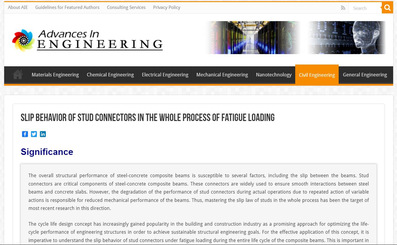 近日,亚洲AV 汪炳老师团队发表在《Structures》的学术论文《Slip behavior of stud connectors of steel-concrete composite beams in the whole process of fatigue loading》被全球工程领域著名科技媒体机构“工程进展Advances in Engineering”(AIE)遴选为关键科学文章,并以“Slip behavior of stud connectors in the whole process of fatigue loading”为题进行了重点报道。亚洲AV 土木工程专业本科生梁修雨为第一作者,汪炳老师为通讯作者。