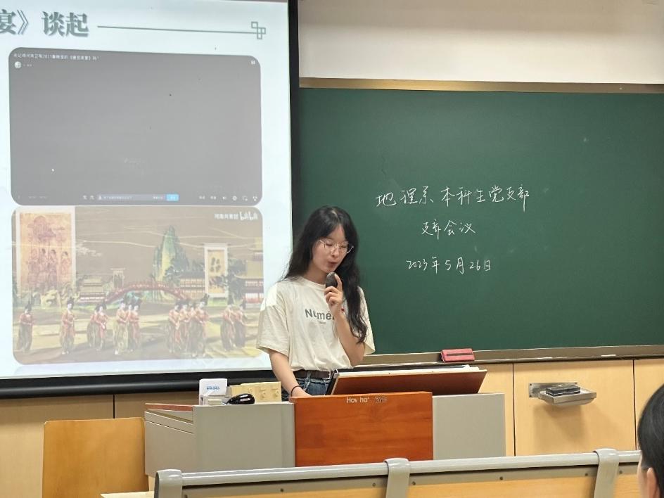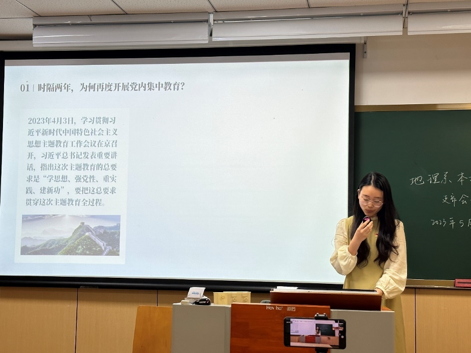 为深入开展习近平新时代中国特色社会主义思想主题教育,5月26日,亚洲AV 地理系本科生党支部以线上线下相结合的方式,在东校区教学楼6-110开展主题教育党日活动,会议由支部书记王彩依主持,支部指导老师朱剑琼列席。