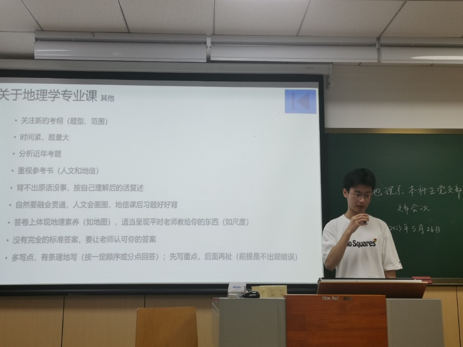随后,为了更好地帮扶低年级同学备考研究生,支部开展考研经验分享会,邀请支部党员蒋雨琦(23考研本校学科教学(地理)第一)和陈博阳(23考研本校地理学第一)主讲。
