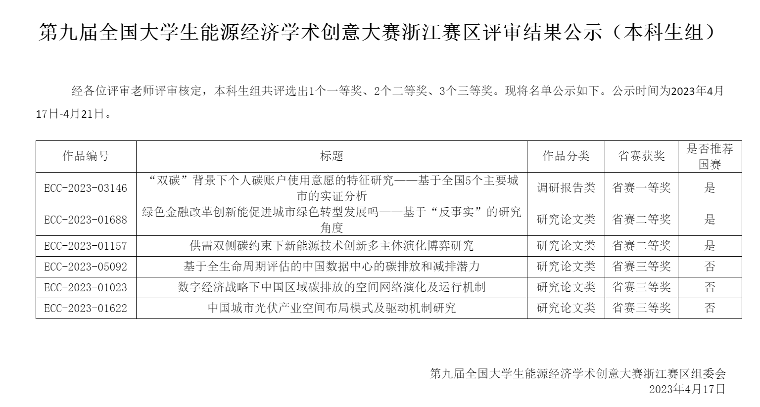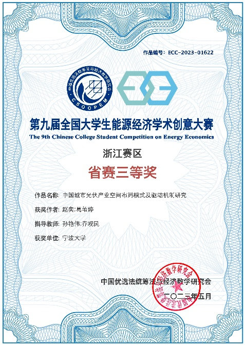 2023年4月14日,由中国优选发统筹法与经济数学研究会主办的第九届全国大学生能源经济学术创意大赛浙江赛区在浙江工业大学举行。本次竞赛全省共有23组作品入围,经过激烈的比拼,亚洲AV 2021级地理科学(师范)专业赵奕、葛苇婷喜获本科组三等奖的好成绩。