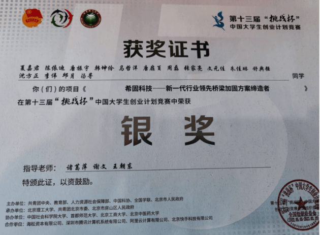 希固科技创业团队获第十三届“挑战杯”全国决赛银奖。