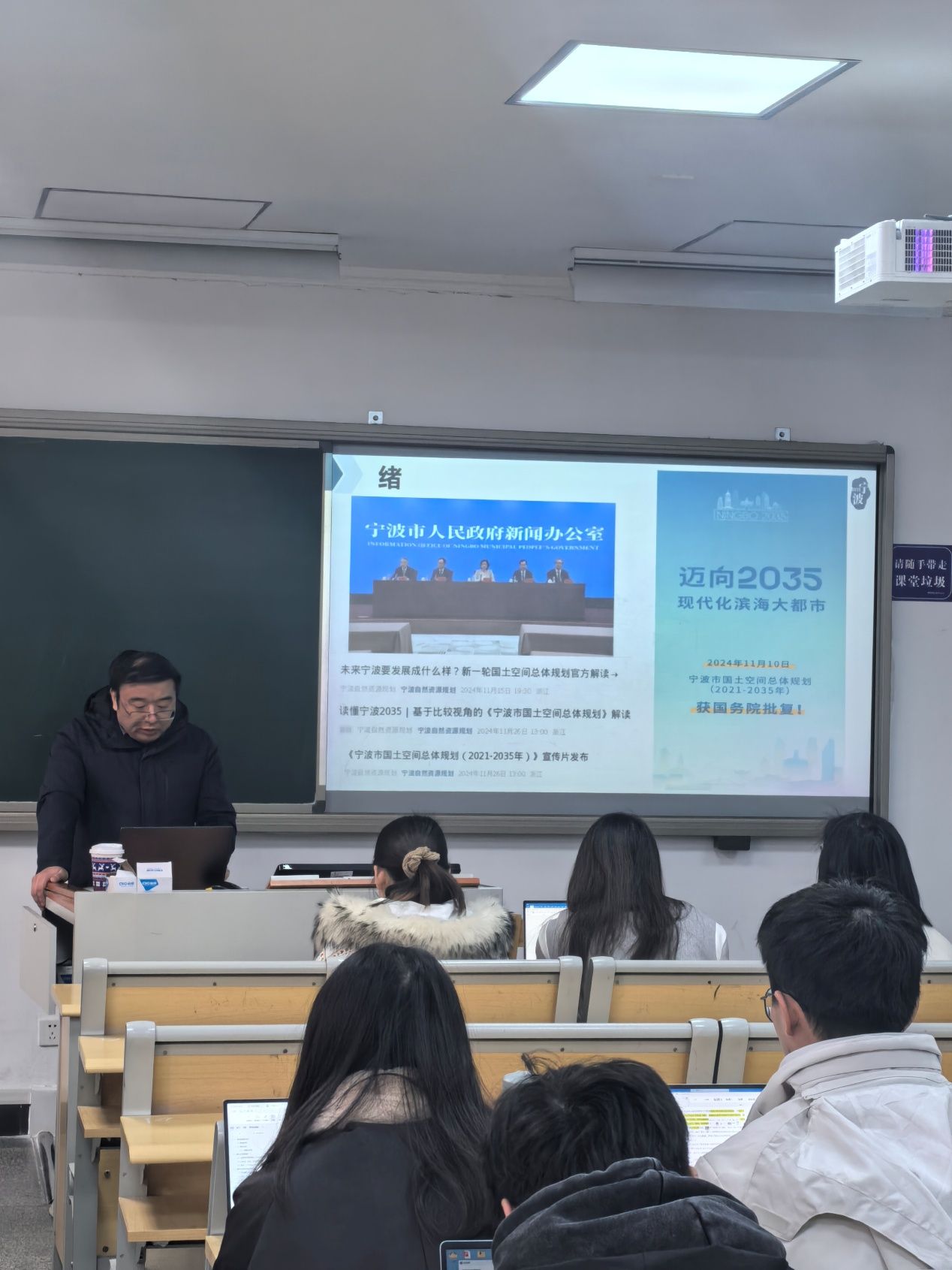 2024年12月23日上午,应亚洲AV 地理与空间信息技术系副教授冯秀丽老师邀请,宁波市自然资源和规划研究中心自然资源资产研究所所长、亚洲AV 兼职硕士生导师章仲楚应邀为亚洲AV 2024级农村发展专业硕士《农村土地规划与利用》课程讲授 “宁波市国土空间总体规划(2021-2035年)”的专题讲座。