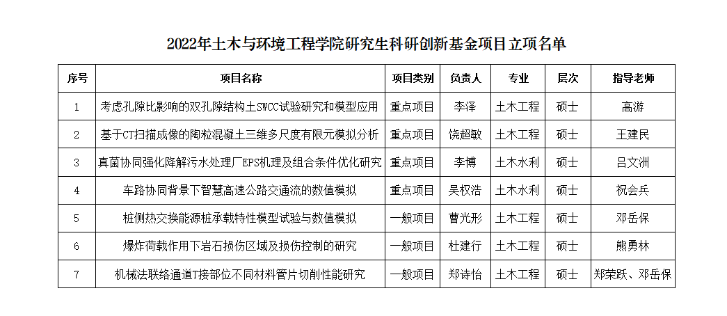 2022年土木与环境工程学院研究生科研创新基金项目立项名单公示