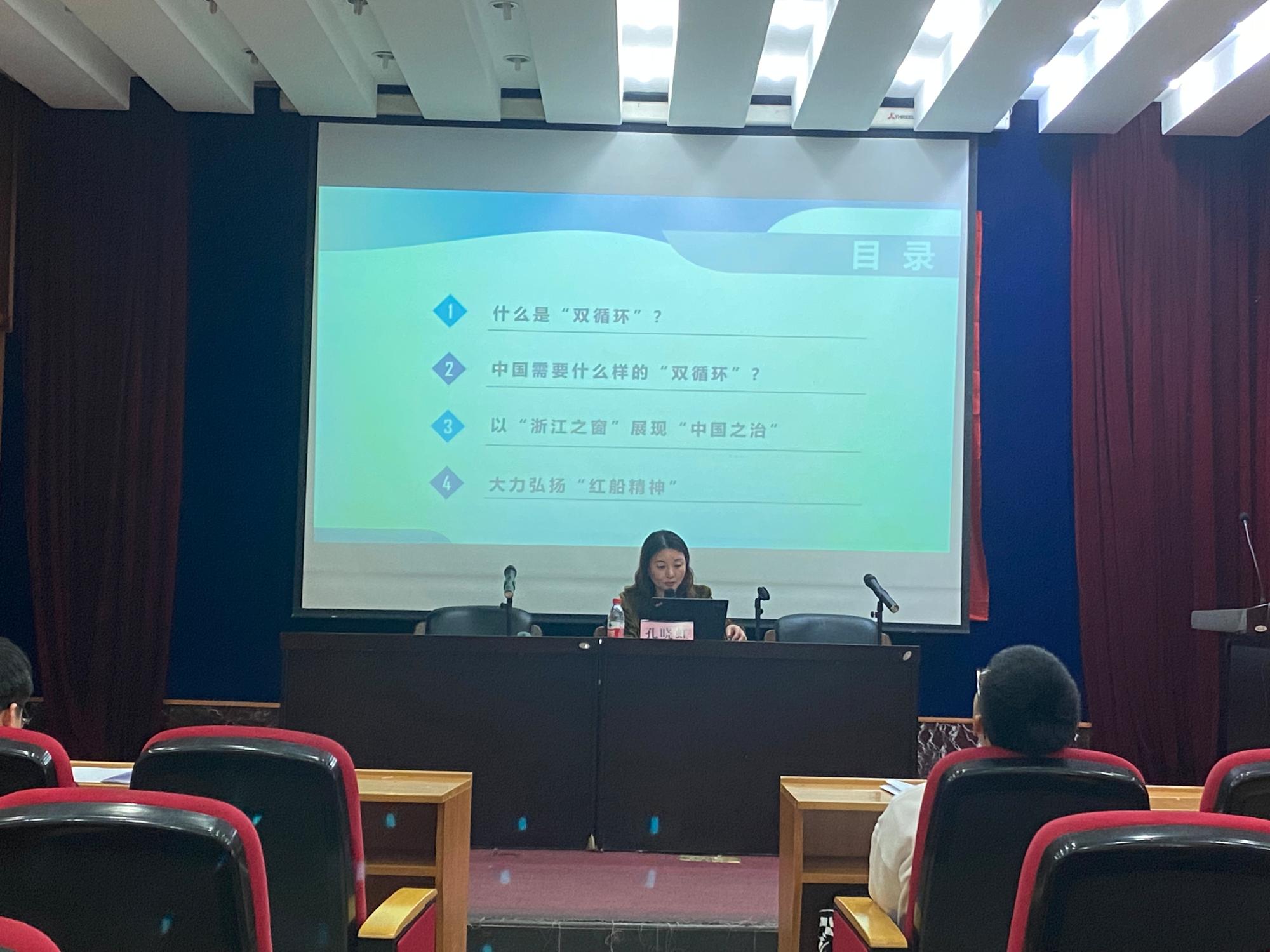 随后,孔晓虹书记为党校学员带来党校第一讲《弘扬红船精神,构建新发展格局》。她从汶川大地震的回忆中讲起,强调了中国青年与国民经济发展息息相关,就双循环的国家战略、“中国之治”在浙江发展中的体现以及“红船精神”的大力弘扬展开阐述。2020年5月14日,中央首次提出“构建国内国际双循环相互促进的新发展格局”。构建基于“双循环”的新发展格局是党中央在国内外环境发展显著变化大背景下,推动我国开放型经济向更高层次发展的重大战略部署。近些年来,中国消费市场的趋势向智能化、高端化、国际化发展,在这样的发展变化下,公共产品已成为政府投资的核心,国家也将大力投入资金实现科技创新。国家的治理带动着浙江发展,浙江在“八八战略”指引下,城乡居民人均可支配收入和生产总值持续增长。而红船精神是新时代发展的坚定支撑,对于当前我们推动社会主义现代化建设伟大工程和加强党的先进性建设伟大工程具有十分重要的现实意义。入党积极分子和发展对象,要继承和弘扬红船精神,将红船精神贯彻学习过程,始终保持党的两个先锋队的性质,使党始终保持蓬勃朝气、昂扬锐气和浩然正气,使党永葆马克思主义的政治本色,确保党始终成为中国特色社会主义事业的领导核心,始终走在时代前列。