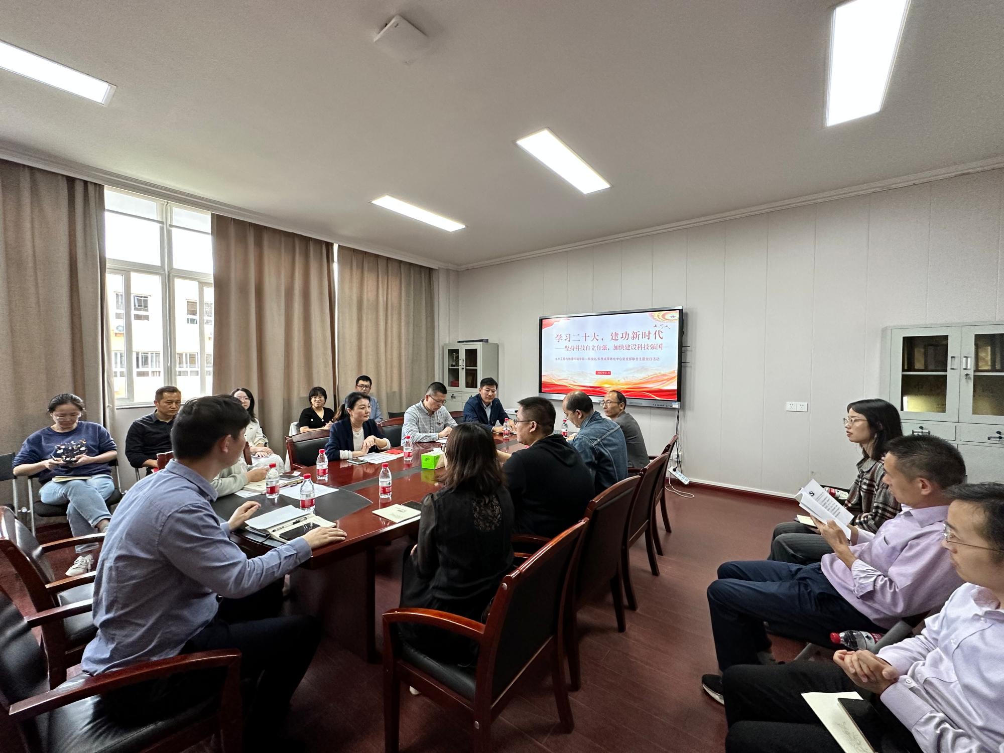 11月11日下午,亚洲AV 党委与科技成果转化中心党支部联合开展“学习二十大,建功新时代——坚持科技自立自强,加快建设科技强国”主题党日活动,科技处/科技成果转化中心党支部党员代表、亚洲AV 部分教师党员代表参加了此次活动,会议由土环学院党委副书记、纪委书记朱剑琼主持。