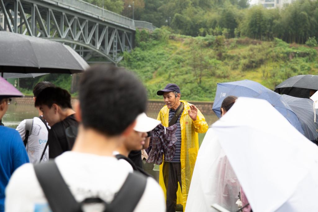 行至藏山大桥下,童老师为大家讲起了藏山大桥的历史。藏山大桥1934年由德国人设计建造,桥梁全长156米,曾是通往新昌方向的主要桥梁,1949年解放军通过藏山桥进入溪口,解放溪口。藏山大桥经历了多次翻修,见证了当地时代的变迁,也承载着溪口时光记忆。