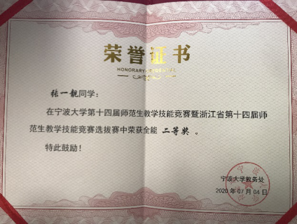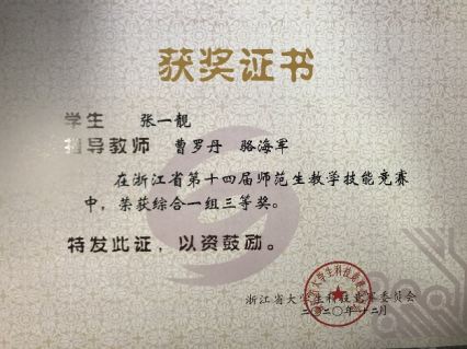 此前,张一靓同学还在2020年11月14—15日举行的浙江省高等学校第十四届师范生教学技能竞赛与来自全省的历史、思想政治、历史与社会、心理四个其他学科的师范生同台竞争,荣获三等奖。