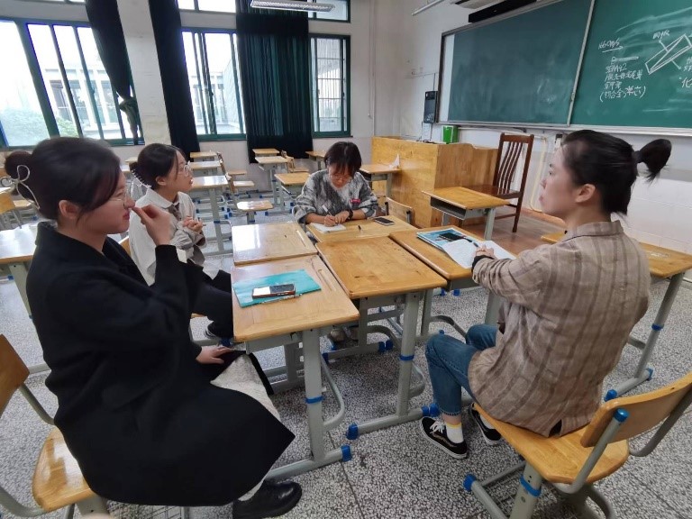 课下,两位老师及时对课堂教学进行了逐个点评。叶玲霞老师对实习老师们的教姿教态予以肯定,同时也指出教学过程中存在的问题与不足,譬如,在板书设计、讲课声音上尚有提升的空间。吴芳老师主持进行了本轮授课的组会,指出了设计教学内容时应详略得当,充分考虑学生学情,力求与学生的学习能力相匹配。