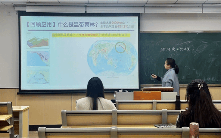 胡雅馨同学首先带大家回顾植被的相关知识,引入温带雨林的背景,初步了解自然环境的整体性。然后借助“鲑鱼洄游”途中发生的现象,结合视频材料和板书,揭示了“自然环境的整体性”。自然环境的各要素进行着物质迁移和能量交换,形成一个相互渗透、相互制约、相互联系的有机整体,也产生了生产、平衡的功能。