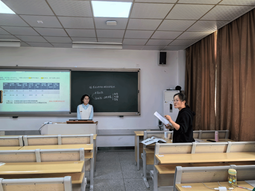 米玛拉姆同学选择人教版必修二第三章第三节“服务业区位因素及其变化”为教学内容,以蜜雪冰城的选址展开服务业区位因素的讲解,同时通过与喜茶的对比讨论、设置任务链以让学生学会分析影响服务业区位选择的因素。季璐迪与刘晴在对课件的美观与逻辑性提出了建议。张老师对于流畅的设计进行了赞扬,对于从小切口进行讨论的教学活动给予高度评价。徐老师点出了课件中表格的逻辑性问题,同时启发大家可以对图表等材料进行深入挖掘。