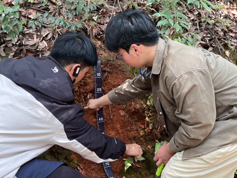 随后我们在沿路观察到了成片的裸露土壤剖面,便开展分层采集土壤剖面的活动。天童山主要以山地黄红壤为主,是红壤到黄壤的过渡类型。黄红壤主要成土过程是淋溶作用和脱硅富铝铁化作用,其典型的土壤结构是A(腐殖质层)-BC(过渡层)-C(母质层)。在高梅香老师的讲解与演示下,我们充分了解了此处黄红壤剖面的基本特征,并使用土壤剖面尺做整体剖面测量,用参考比例尺等工具观察观察微形态(如蚂蚁巢穴),最后自下而上完成土壤剖面样本分层采集并做相关记录。