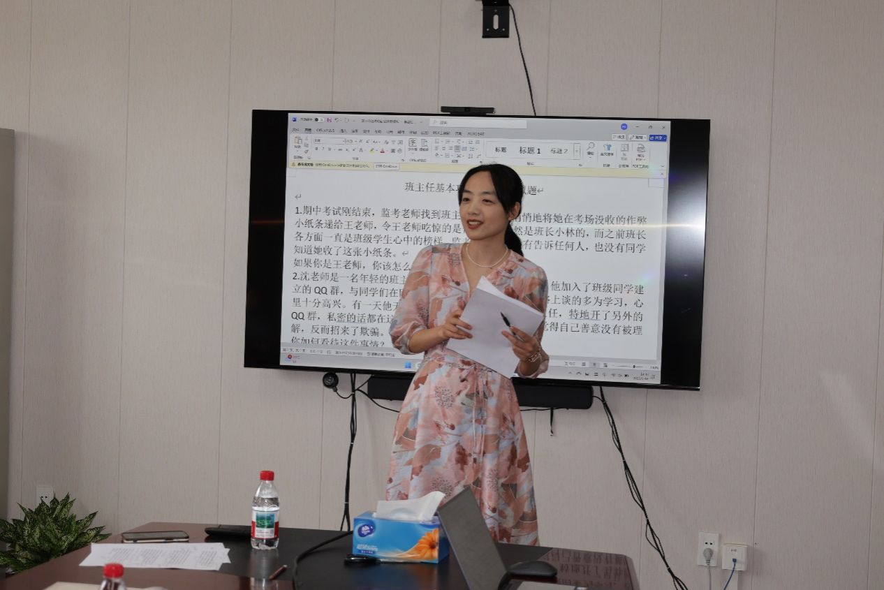 参赛选手们通过抽签的方式确定题目,题目涵盖了班级管理、学生心理健康、家校沟通等多个方面,极具代表性和挑战性。选手们根据题目要求,结合自身学习和实践,发表了自己对班主任工作的理解和看法,并提出了解决问题的策略和方法。选手们进行了角色扮演,在场的两位老师为参赛选手创设了真实情境,模拟班主任处理日常班级事务,如处理学生矛盾、落实家校联系、学生身心健康发展问题解决等。选手们沉着冷静,应对自如,展现了良好的沟通能力、应变能力和教育智慧,