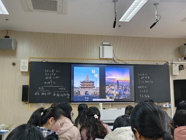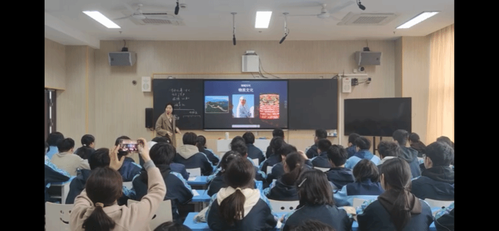 进入校园后,我们先前往微格教室进行正式授课。杨淑榴老师以“哪一桌是宁波的年夜饭”进行导入,通过对比宁波和陕西年夜饭的异同,引导学生思考一方水土养一方人促使地域文化的形成,并带领学生通过PPT的图片分析总结地域文化的表现形式。进一步的,深挖课本案例,以景观视角作为切入,对比分析云南红河哈尼梯田与东北平原乡村景观的异同,并探究自然条件和社会科技水平对其的影响以及人类如何对其利用改造。除乡村景观外,杨老师以哥特式建筑与中国四合院作为切入,引导学生分析中西方城镇景观的差异以及其背后的自然和人文原因。课程末尾,发散学生思维,引导学生思考宁波当地的地域文化景观,巧妙地将乡土资源融入地理教学中。杨老师在授课过程中,灵活运用现代化教学设备,以学生为主体,设置小组讨论、学生上台绘制等环节,培养了学生的地理核心素养。
