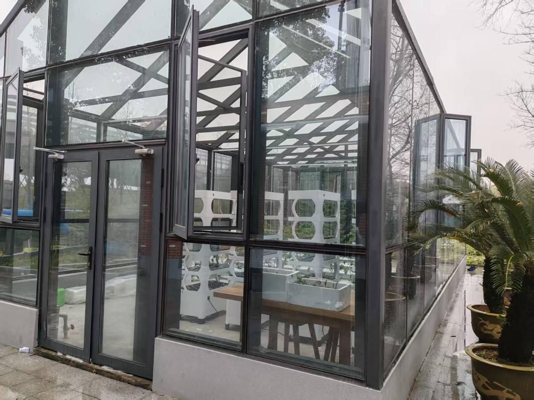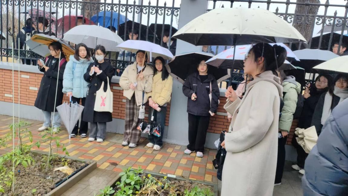 微雨如酥,宁波龙赛中学浸润在一片朦胧的水雾中。首先跟随劳妮妮学姐的脚步,我们开展了龙赛中学的校园探访之旅。步入校园,绿意如潮涌来。淅沥沥的雨滴从叶尖滑落,整个校园沉浸在静谧的学习氛围之中。穿过教学楼,踏过开阔的操场,一片绿意盎然的“田间地头”和一个透明的阳光房豁然展现在眼前,这就是龙赛中学的农创基地。徐皓老师向我们简单介绍了此处基地的来源。劳妮妮学姐告诉我们,此处种植的蔬菜基本上是学生在专业师傅的指导下利用周三下午的活动课时间进行开展的,而在阳光房中也同样是年轻教师们种植的生菜与小番茄。隔壁红色的建筑则是堆放例如铲子、锄头等各种生产工具的房间。穿过长长的走廊,我们来到了一片黄灿灿的油菜花田与石头陈列展前,劳妮妮学姐表示,此处各种类的岩石皆是来自不同的地区,其中黑色气孔构造的为玄武岩。而隔壁油菜花田的花籽则可以真的做成菜籽油。除此之外,还有许多小块的田地种植如胡萝卜、白萝卜等蔬果。
