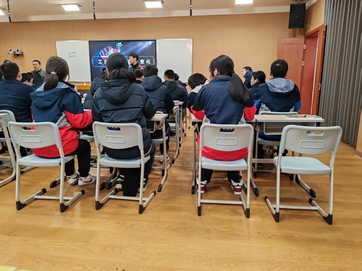 课堂正式开始,由作为校长的杜老师亲自上课,从工业革命引入,自然过渡到鞍钢与宝钢的对比思考。进一步从书本上的例题出发,以学生为本,分析题目答案,培养学生独立思考的能力,并带领学生完善课程板书,启发学生思维。最后更是以deepseek、宇树科技等时兴热点话题作为结尾,促进学生课后的持续学习。杜老师在授课过程中注重课堂氛围穿插,囊括了个人思考、同桌合作、小组合作等环节;把握课堂节奏,及时提示学生思考方向;呈现了情境交融的教学范例,力求让同学们在探究真实问题中落实学科素养。课堂最后更是联动同学们与学生一起回答问题,巧妙结合大学与高中的学习内容。