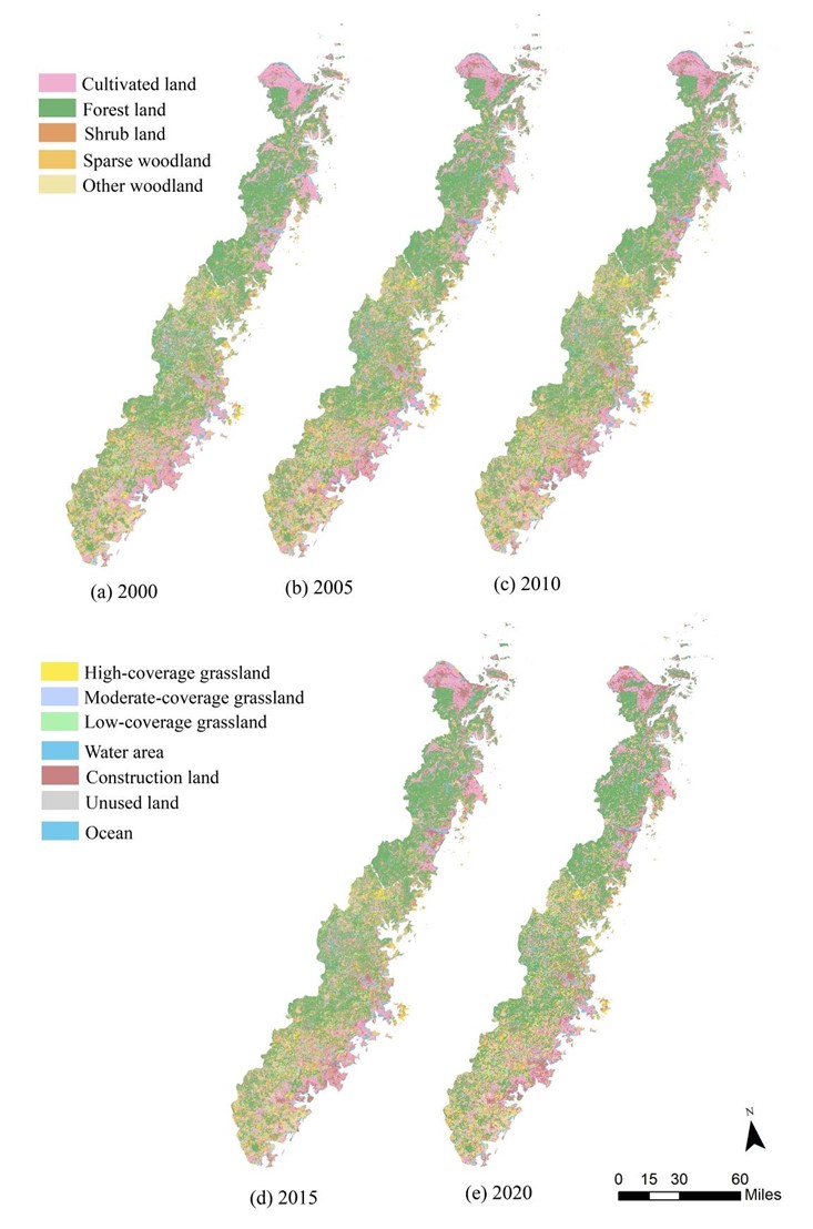 翁花妍为第一作者发表的论文题目为“Spatial-Temporal Changes and Driving Force Analysis of Green Space in Coastal Cities of Southeast China over the Past 20 Years” (Land;论文链接//www.mdpi.com/2073-445X/10/5/537)。该文分析了东南滨海城市城镇化与绿地面积和分布之间的关系,得出城镇化在初期加速绿地面积增加,但随着城镇化速度放缓,绿地面积将不再增加,甚至两者出现负向制约。除城镇化影响外,滨海地区绿地的空间分布还与地理因子限制有关,尤其是人均水分拥有量在未来可能是绿地面积不再增加的主要限制因子。在地理限制作用不断增加的条件下,当前的城镇化建设应着重考虑生态安全。