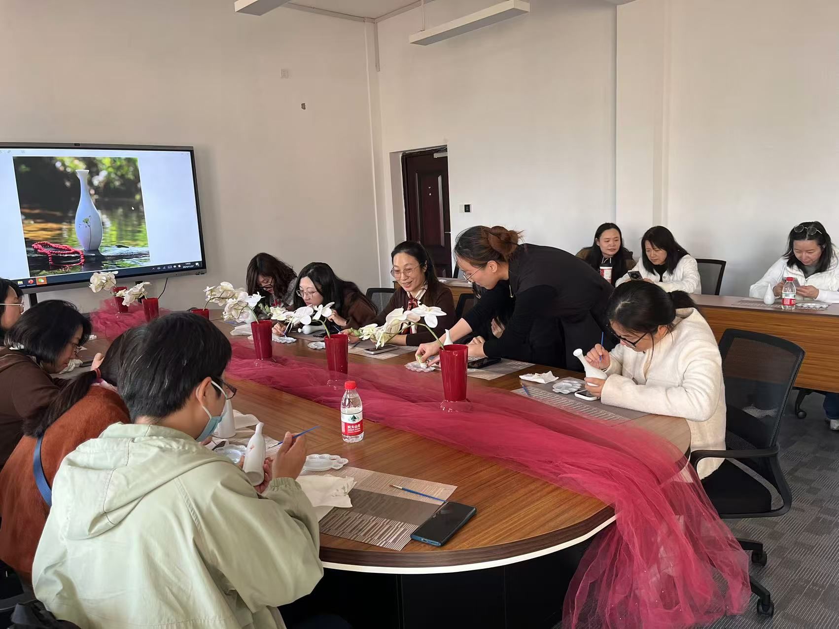 活动当天,学院分工会为每位参与者准备了精美的瓷瓶和丰富的绘画工具。这些瓷瓶造型各异,既有传统的瓷瓶,也有现代简约风格的白色瓷瓶,为教职工们提供了广阔的创作空间。活动现场,气氛热烈而温馨,教职工们纷纷拿起画笔,沉浸在艺术的海洋中。