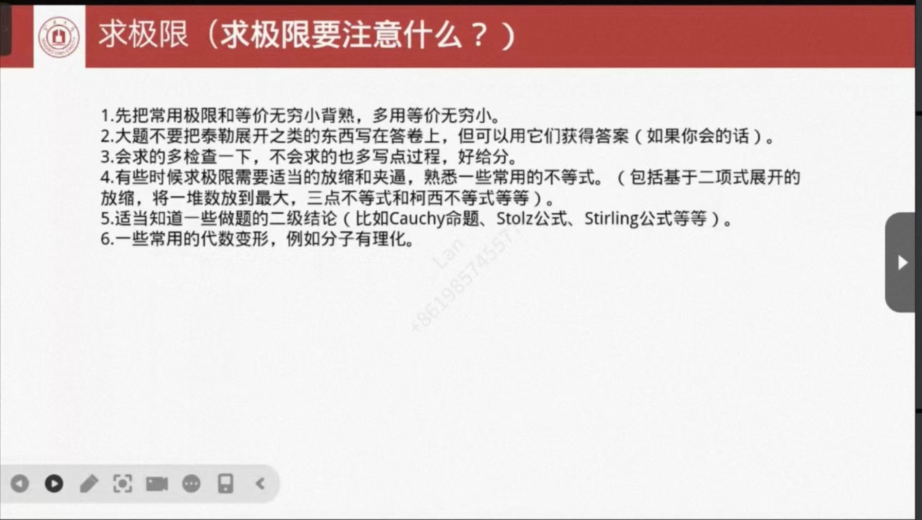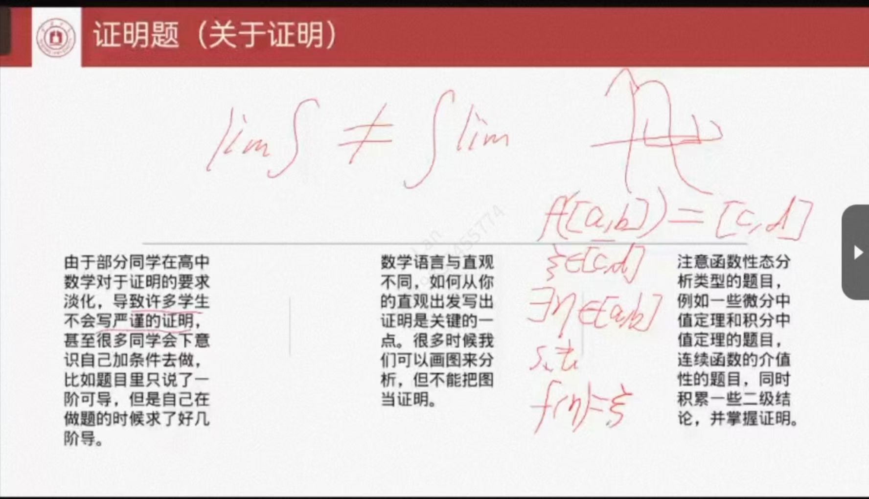 在具体内容讲解中,徐茁学长还对高等数学中的重点板块进行了系统梳理,从极限、导数到积分计算,通过典型例题串联知识点,帮助同学们建立起更清晰的知识框架。在讲到证明题时,学长特别提醒大家注重逻辑严谨性,强调依据定理条件逐步推导,避免因审题不严或想当然而失分。