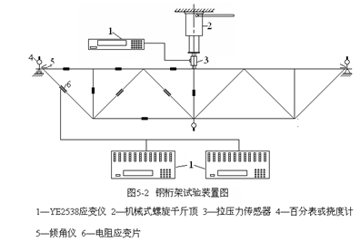 本试验采用缩小比例尺寸的钢桁架作非破坏试验,以达到学习的目的。其试验装置如图5—2所示,采用中点加载,用手动机械式螺旋千斤顶施加,用拉压力传感器控制荷载值,由静态电阻应变仪显示。杆件应变测 量点均设置在每一杆件的中间区段,电阻应变片或杠杆式引伸仪均装在截