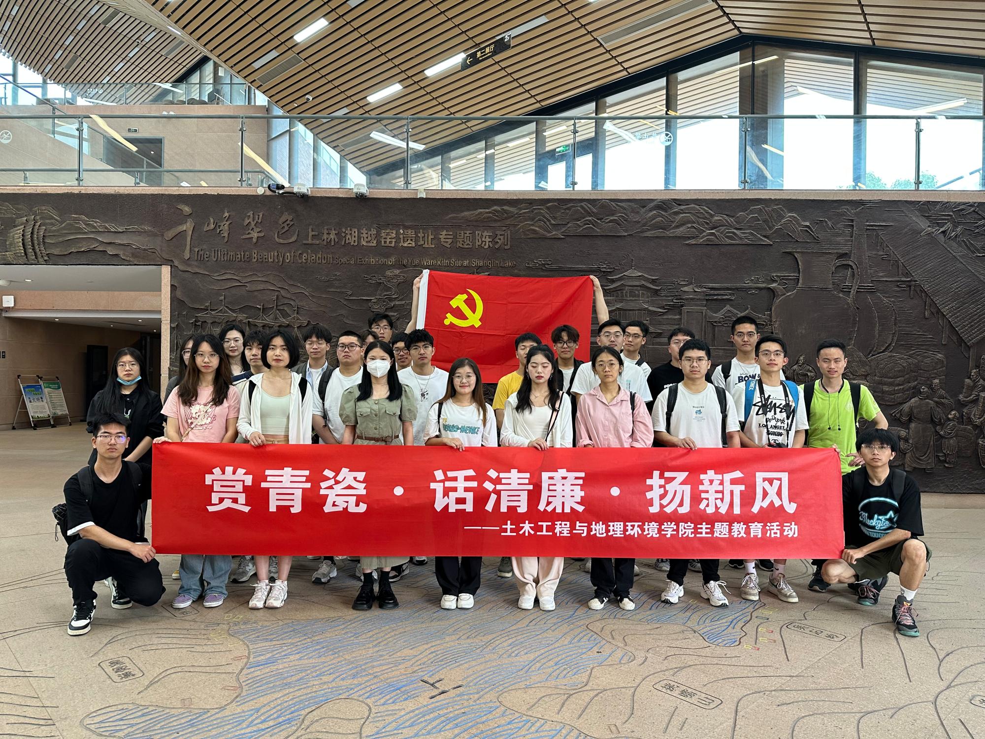 “九秋风露越窑开,夺得千峰翠色来”,主题教育的第一站,同学们来到了上林湖越窑青瓷博物馆,了解了越窑青瓷的发展历史、独特的制作工艺以及历史影响等,参观了越窑青瓷中的精品——“秘色瓷”。青瓷光洁透彻、更少杂质,呈现出如冰似玉的绝美效果,古瓷尚青,青则清,清则廉,在参观中,同学们感受到了青瓷中蕴含的清廉内涵以及“守身如玉”“静气定力”的优秀品质。