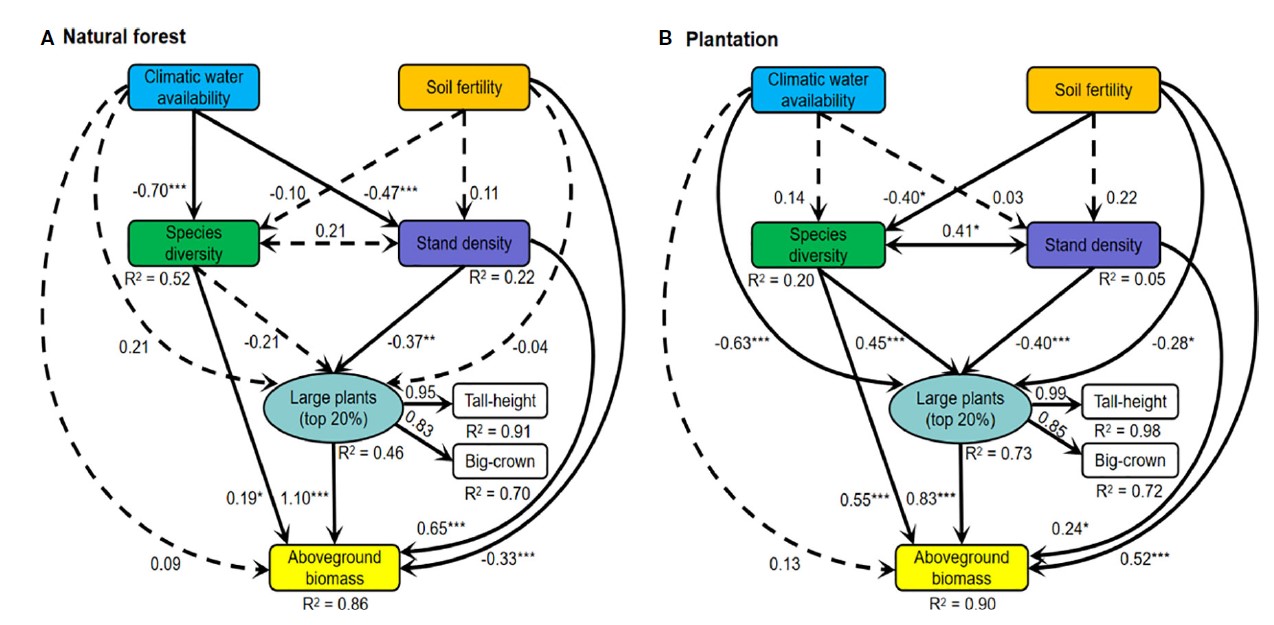 管敏莎与硕士研究生合作发表题为“Large plants enhance aboveground biomass in arid natural forest and plantation along differential abiotic and biotic conditions(Frontiers in Plant Science;论文链接//www.frontiersin.org/articles/10.3389/fpls.2022.999793/full)”。此论文针对碳中和碳达峰的国家重大需求,分析了森林碳汇的积累机制,发现在人工林和自然林内,生物多样性都能够对地上生物量起促进作用。但是,这个过程会受到“大树效应”的控制。论文建议维持和提升森林碳汇时,尤其应注意大树的调节和控制作用。这一结论为增加森林增汇提供了新理论。