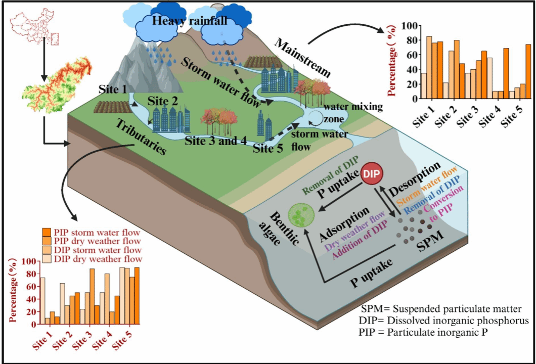 在全球气候变化背景下,暴雨事件频发正加剧陆地污染物向淡水生态系统的输入。磷作为水体富营养化的关键限制元素,其在溶解态与颗粒态间的转化机制一直是环境科学研究的难点。已有研究表明暴雨径流可通过土壤侵蚀输入磷污染物,但不同土地利用类型(城镇、农业、森林)对磷形态(溶解态、胶体态、颗粒态)转化的调控机制尚不明确。本研究选取浙江省丽水市瓯江上游区域,聚焦暴雨径流与土地利用类型对淡水系统中磷形态(溶解态、胶体态、颗粒态)转化的影响与机制,通过对比农业、城镇和森林三种典型土地利用类型,揭示了暴雨期悬浮颗粒物(SPM)浓度与pH升高促使溶解态无机磷(DIP)向颗粒态吸附转化的过程;发现了城镇与农业用地的磷形态转化强度较森林用地高,且暴雨会显著提升胶体磷(CTP)浓度;证实了森林缓冲带可降低磷形态转化速率;为流域面源污染管控提供了关键科学依据。